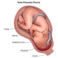 Placenta previa is a condition in which the placenta is attached close to or covering the cervix (opening of the uterus). Placenta previa occurs in about one in every 200 live births. There are three types of placenta previa: