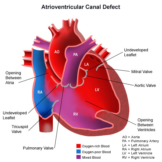 - atrioventricular canal (AVC or AV canal) - atrioventricular canal is a complex heart problem that involves several abnormalities of structures inside the heart, including atrial septal defect, ventricular septal defect, and improperly formed mitral and/or tricuspid valves.