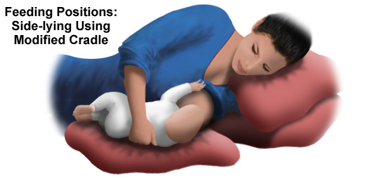 - side-lying using modified cradle - in this position, the baby lies next to the mother with mother's and baby's bodies facing each other. If a pillow under your arm is uncomfortable, try placing your baby in the crook of your arm. This way, you will not be likely to roll over on the baby should you doze off. This position also keeps the baby's head at a good angle to bring baby and breast together, with the baby's head higher than his/her tummy, which can be helpful for babies who are more likely to spit up.
